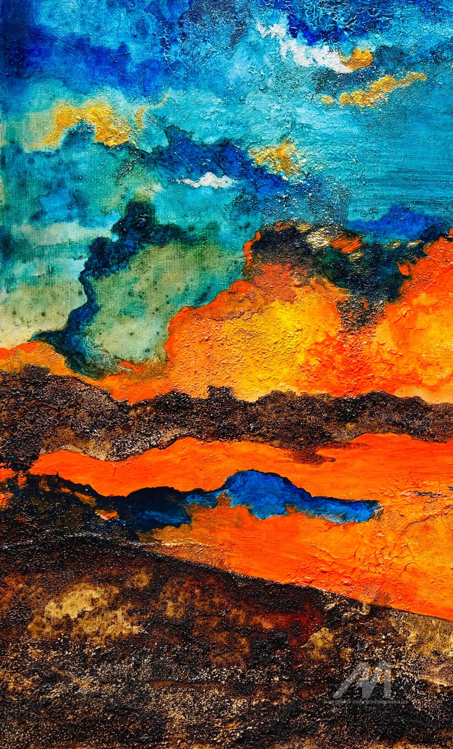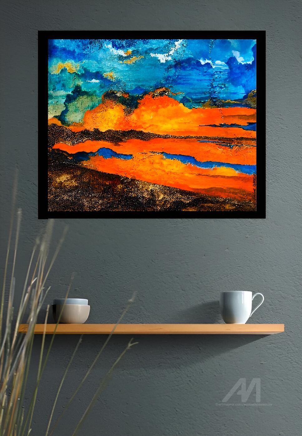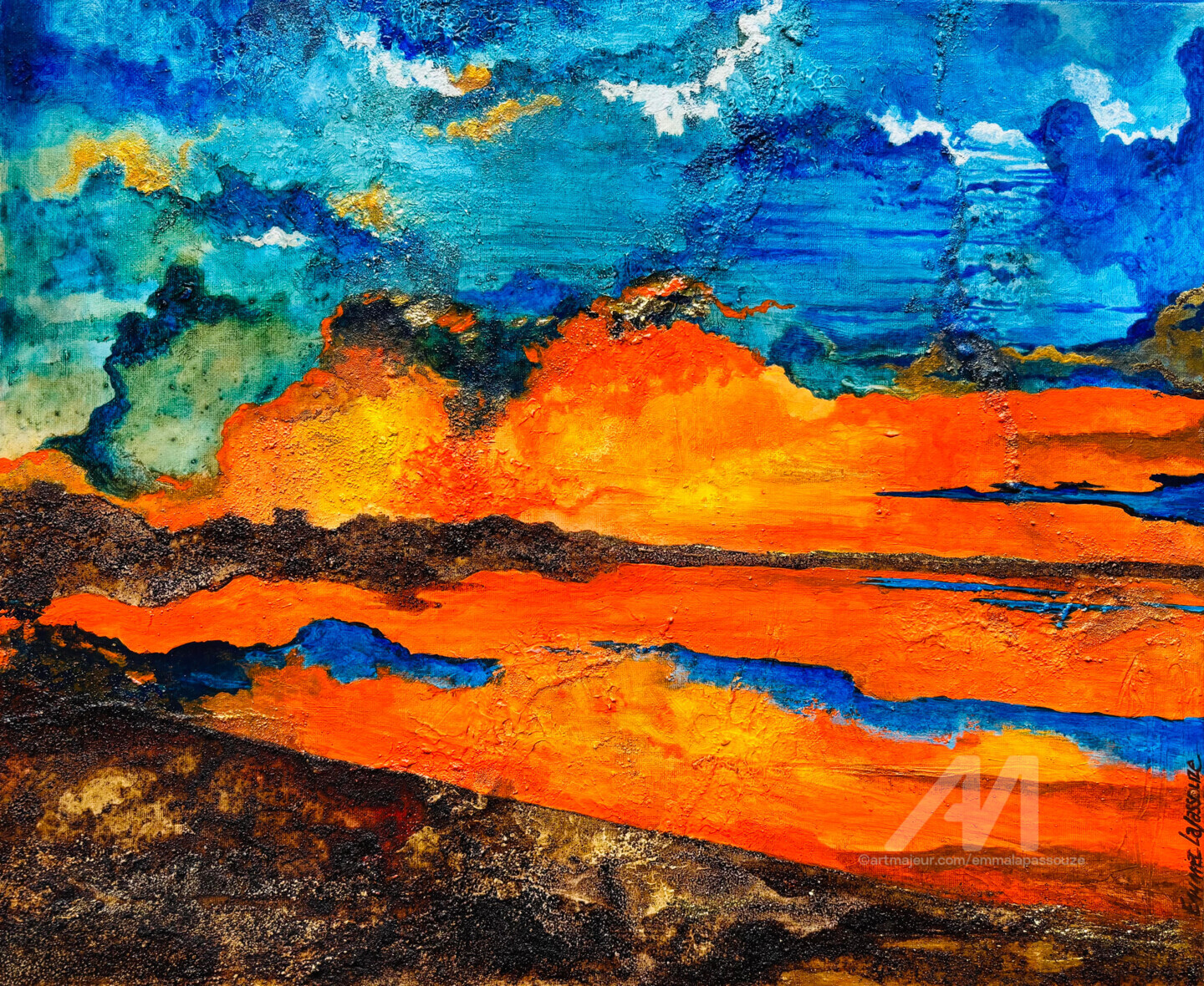 "Rayonnement nocturne" est une peinture acrylique, composée à partir de marc de café. Elle évoque un reflet à la tombée de la nuit dans des couleurs chatoyantes. L’œuvre est vendue dans une caisse américaine noire pour mettre en valeur le sujet